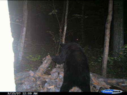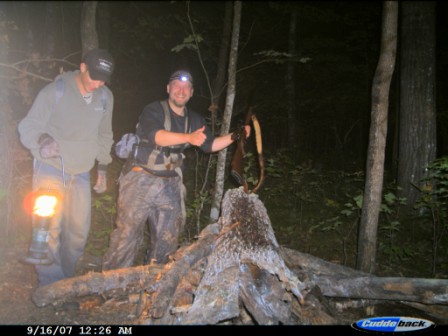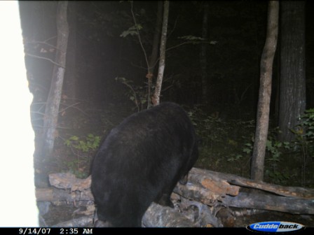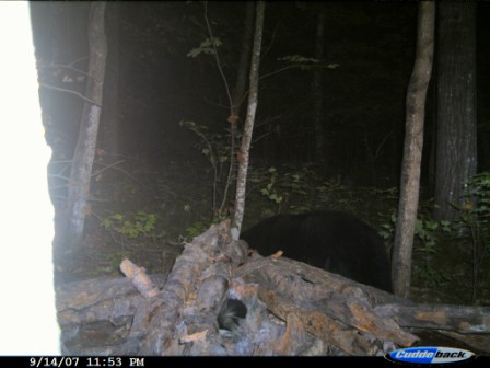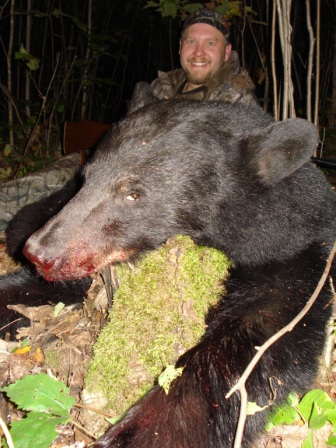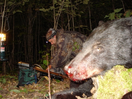 This had to be the third bear that I had on the scouting camera that was the medium-sized bear. He’s not the bigger bear I had on film, but he is the biggest I’ve ever taken, 175 lbs. field dressed (probably well over 200 live weight). He is the first boar I have ever taken, and the first bear I have ever taken (or seen) beyond opening weekend. Persistence had paid off, he had finally made his mistake, and I was fortunate enough to be there to take advantage. After a dash back to town to pickup my lantern and atv (again, no confidence), and a buddy (Thanks Trapper!) to help drag him out, video tape of the blood trail, lots of pictures, and, the always interesting, drag out of the bear woods, we got headed for home at about 1:00am. I apologize for the blood in the pictures! The more I tried to clean him up the worse it got. Once again the Ballistic Silver-Tips did some damage. The first few pictures were from the previous night at the bait.