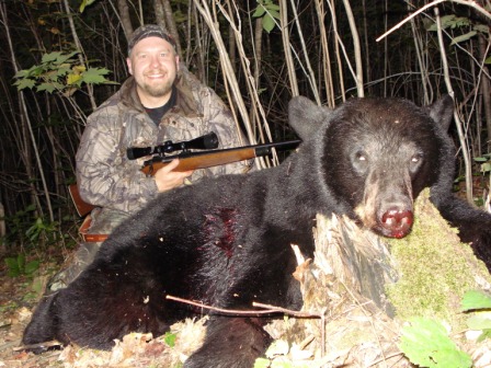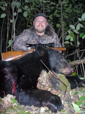 Before I even arrived at the spot where I park my truck, I counted three trucks and two four wheelers of grouse hunters. All evening, there was a lot of shooting to the south of me; what I think were goose hunters because at one point they blasted off 19 shots in one single volley! Half way through the evening’s hunt, I whispered into my video camera that I didn’t think we would be seeing much tonight because of all the commotion in the woods. But I was wrong. At 7:52pm Saturday night, seven minutes before the end of shooting hours, the bear that had been waiting for me to leave the stand each night, burst into the far end of the clearing on an almost direct route for the Stump. I only waited for a broadside shot to squeeze the trigger. One shot that passed through both lungs with the old reliable .308 at 15 yards rolled him sideways. The rack and slide of my Remington 700 and the metal on metal bounce of the spent casing onto the platform of my stand rang through the forest canopy while the bruin crashed about 50 yards into the pencil brush as he tried to circle back from where he entered. He had probably gone half that distance before establishing a considerable blood trail. Unbelievable! Nice!